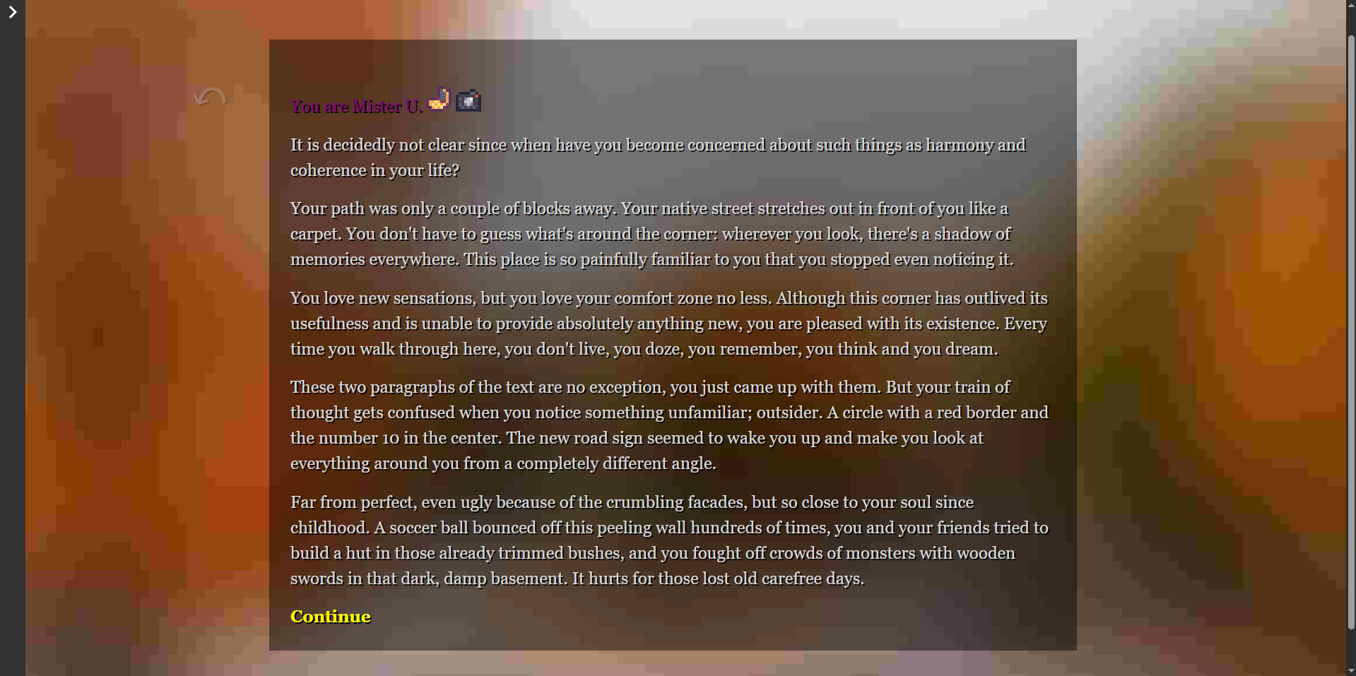 "I'm Mister U" is a small text game about the usual life of a slightly unusual person with a very unusual view of the world. In an hour-long adventure, you will find a sea of analogies, strange dialogues and equally strange events.